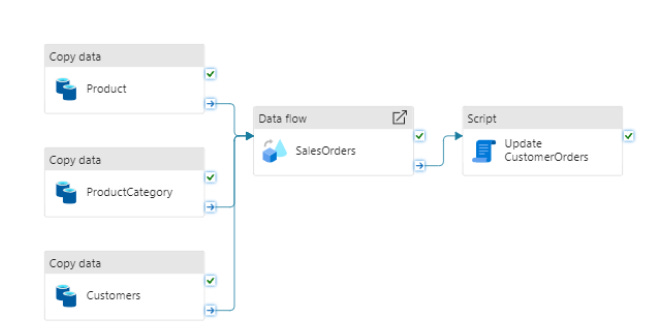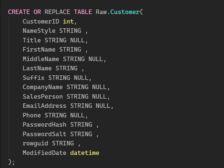 Truncate table Raw.Customer;We configured a pipeline in Azure Data Factory with three Copy Data activities that move data from the SalesLT.Product, SalesLT.ProductCategory, and SalesLT.Customer tables from the Azure SQL Database to the Raw.Product, Raw.ProductCategory, and Raw.Customer tables in Snowflake.