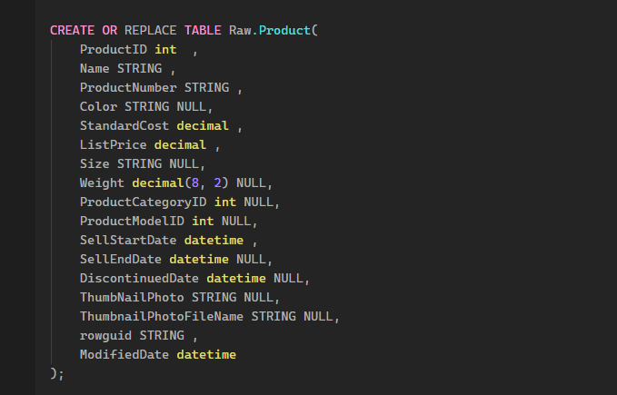 Truncate table Raw.Product;This command truncates the Raw.Product table, meaning it clears all old data from the table before loading the new data each time the pipeline is executed.